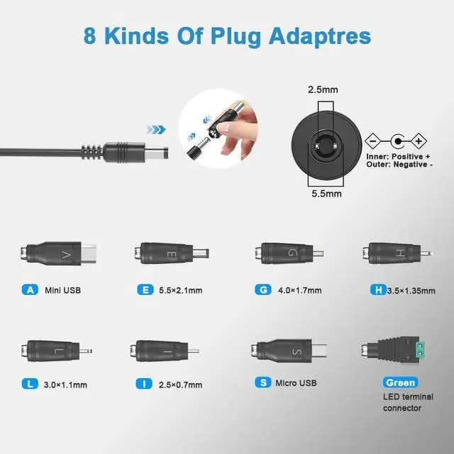 DC plug size: 5.5 mm x 2.5 mm compatible with 5.5 mm x 2.1 mm. 8 Tips( 5.5 * 2.1 mm 4.0 * 1.7 mm 3.5 * 1.35 mm 3.0 * 1.1 mm 2.5 * 0.7 mm mini USB Micro USB LED terminal connector).