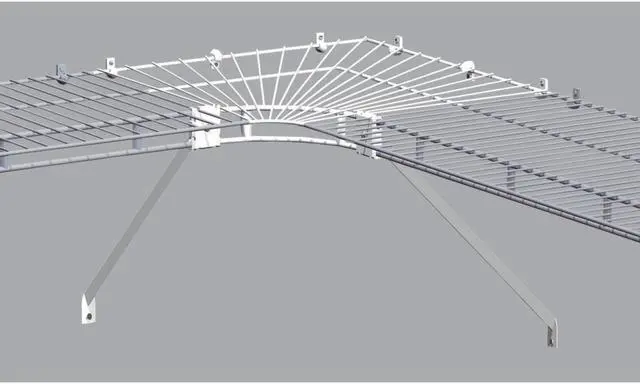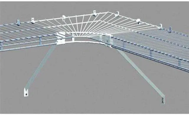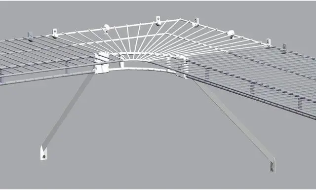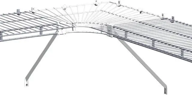 White corner shelf has a vinyl-coated wire construction. Shelf and rod corner shelf has permanently attached hang rod allowing continuous hanging of hangers around the corner. Install with fixed mount using back clips, wall brackets, and support brackets, or with the ShelfTrack standards and brackets system. Mounting hardware included.