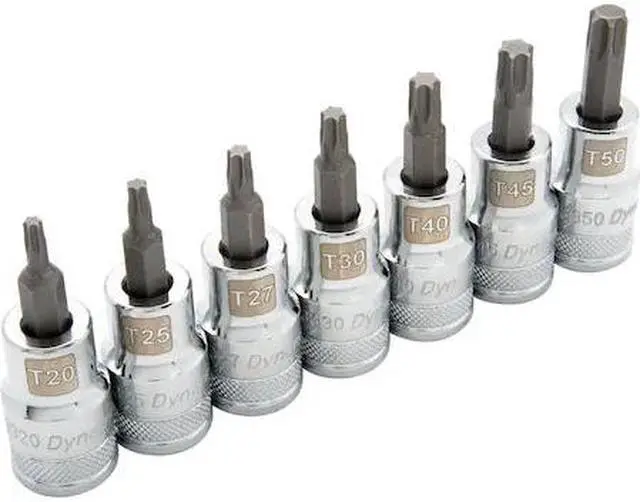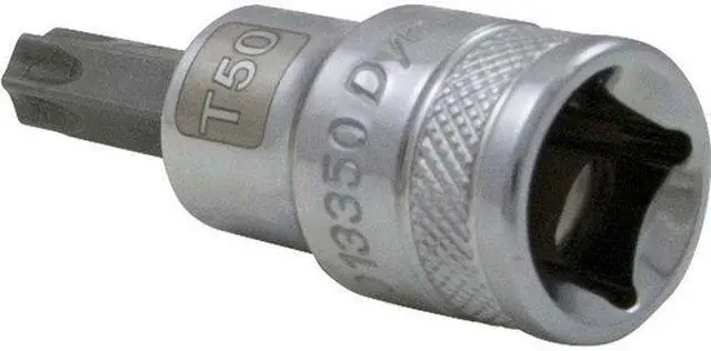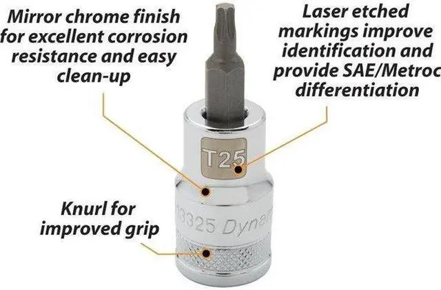 Drive Type: Torx®. 1/2" Drive. Chrome finish for maximum resistance against corrosion. Large laser etched markings improve size identification and provide differentiation between SAE and metric sizes. Knurled ring provides superior grip for quicker and easier removal of socket from ratchets and attachments. Meets ANSI standards.