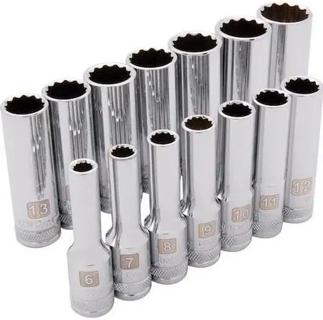 Drive Type: 12 Point. 3/8" Drive. Chrome finish for maximum resistance against corrosion. Large laser etched markings improve size identification and provide differentiation between SAE and metric sizes. Knurled ring provides superior grip for quicker and easier removal of socket from ratchets and attachments. Brand, part number and size also hard stamped. Meets ANSI standards.