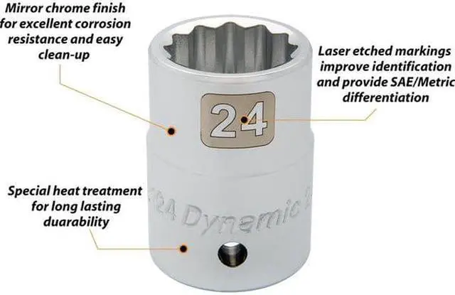 Drive Type: 12 Point. 3/4" Drive. Chrome finish for maximum resistance against corrosion. Large laser etched markings improve size identification and provide differentiation between SAE and metric sizes. Knurled ring provides superior grip for quicker and easier removal of socket from ratchets and attachments. Brand, part number and size also hard stamped. Meets ANSI standards.