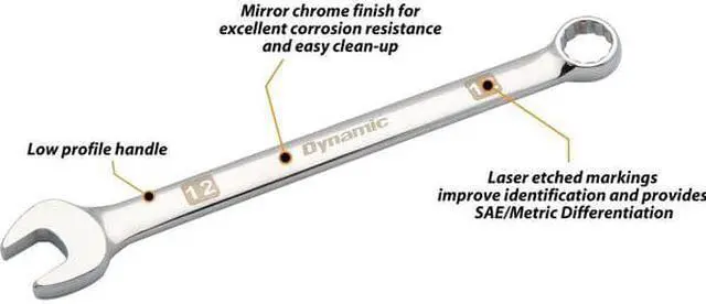 Drive Type: 12 Point. Laser etched markings improve size identification and provide differentiation between SAE and metric sizes. Chrome finish for maximum resistance against corrosion. 15° angled open and 15° offset boxed end. Meets ANSI standards.