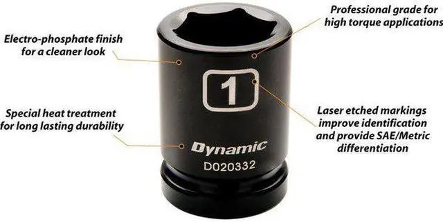 Drive Type: 6 Point. 3/4" Drive. Corrosion resistant black phosphate finish. Large laser etched markings improve size identification and provide differentiation between SAE and metric sizes. Meets ANSI standards.