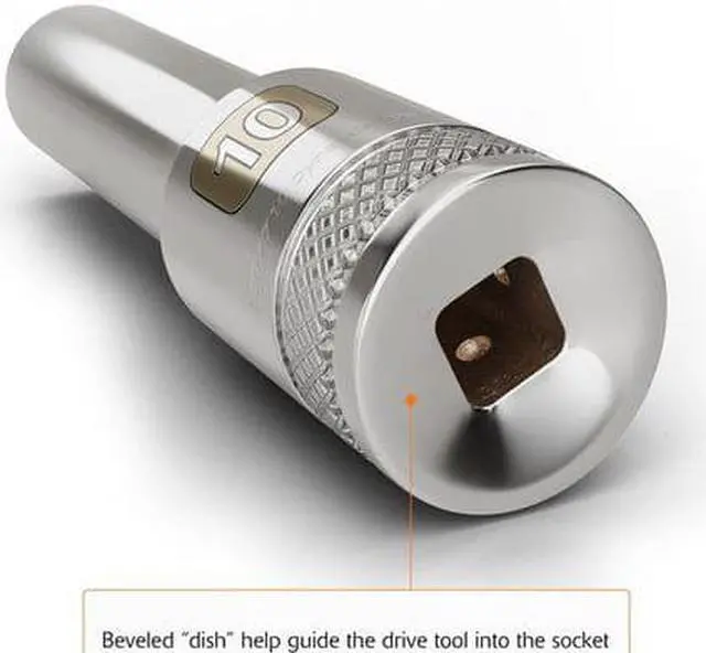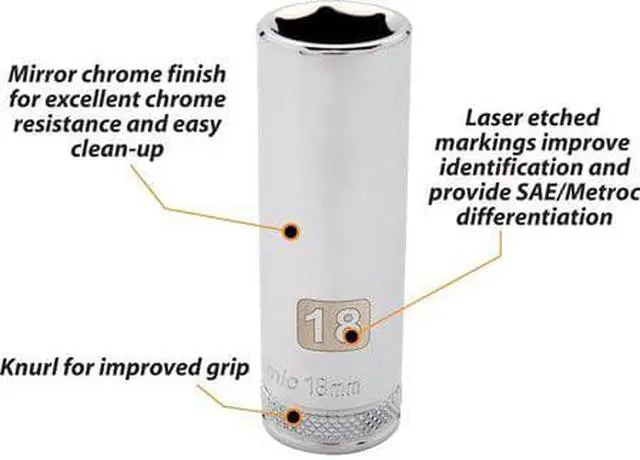 Drive Type: 6 Point. 1/2" Drive. Chrome finish for maximum resistance against corrosion. Large laser etched markings improve size identification and provide differentiation between SAE and metric sizes. Knurled ring provides superior grip for quicker and easier removal of socket from ratchets and attachments. Brand, part number and size also hard stamped. Meets ANSI standards.