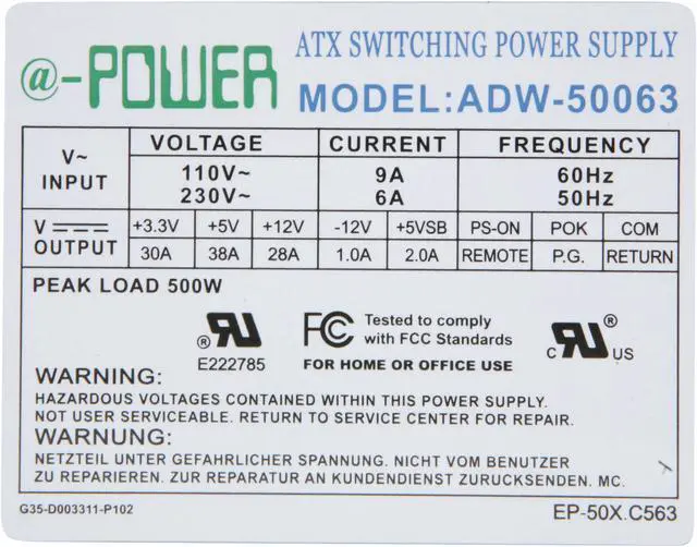 | Output | +5V@38A, +12V@28A, +3.3V@30A, -12V@1.0A, +5VSB@2.0A |