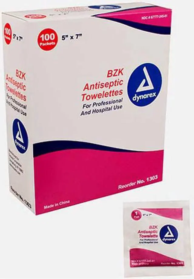Dynarex BZK Antiseptic Towelettes are alcohol free and cleanse without stinging. Each non-scented towelette is saturated with 1:250 benzalkonium chloride. Measuring 5 x 7 inches fan folded, the BZK antiseptic pads are an ideal wipe for perineal and maternity care, as well as clean catch kits