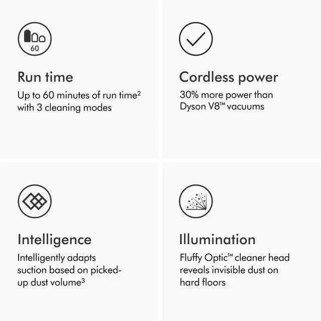 power to clean anywhere: The versatility of Dyson cordless technology makes cleaning your home easier. Powerful cleaning of floors, hard-to-reach places, and mattresses. Gentle on hard floors. Tough on dirt.: Engineered with soft nylon and anti-static and carbon fiber filaments to remove dust from hard floors and narrower gaps. With a low profile to reach further under furniture. De-tangling Motorbar cleaner head for all floors: Powerfully sucks up dust and hair from all floors. De-tangling comb automatically clears hair from the brush bar. Hair screw tool.: De-tangling conical brush bar spirals hair off and into the bin. Motor-driven cleaning for small spaces. Picks up long hair and pet hair. Fast.