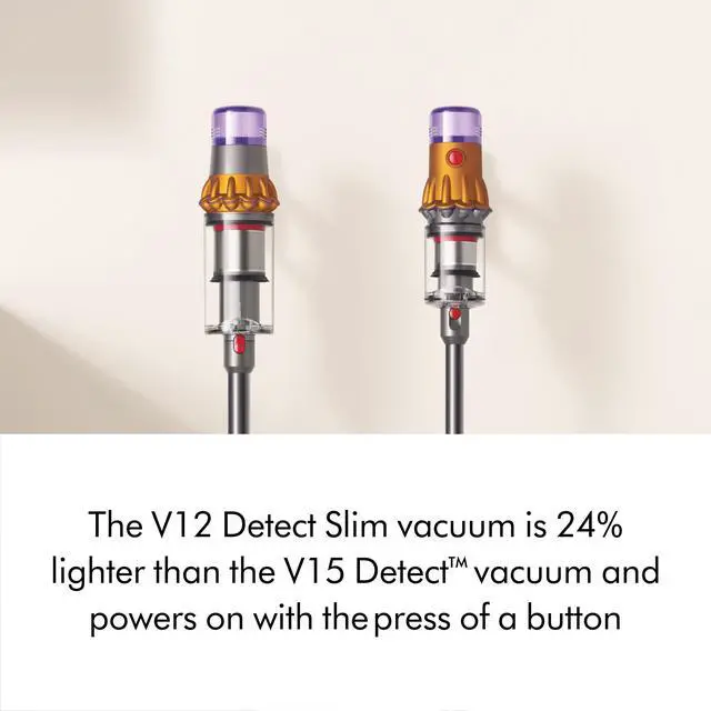 Dyson V12 Detect Slim Cordless Vacuum Cleaner | Nickel | RefurbishedThe Dyson V12 Detect Slim is Dyson's lightest intelligent cordless vacuum. It's engineered with the power, intelligence, versatility, and run time to deep clean your whole home in a lightweight, compact format. Dyson illumination reveals invisible dust on hard floors. The Dyson V12 Detect Slim intelligently optimizes power and run time based on the debris picked up, reporting it all on the LCD screen. ³ The LCD screen also displays the run time countdown, power modes, and maintenance alerts.
