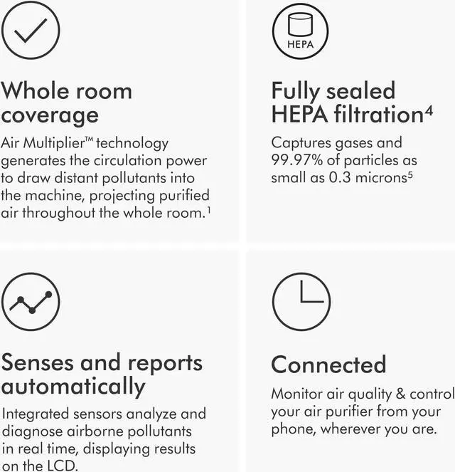 ¹Tested per Dyson internal test standards for whole-room air projection (TM-005021) and purification coverage (TM-003711).