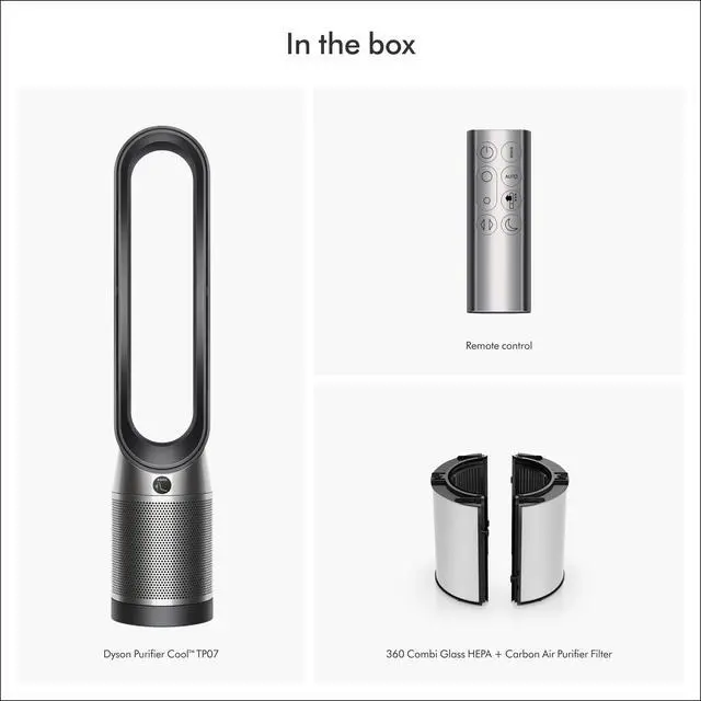 Dyson TP07 Purifier Cool Connected Fan | Black | RefurbishedThe Dyson Purifier Cool purifying fan combines intelligent sensing with an advanced, fully sealed filtration system. Its engineered with two phases of purification so what goes inside stays inside. The HEPA filter captures 99.97 % of particles 0.3 microns in size, and powerful Air Multiplier technology purifies the whole room¹ and cools you. ²