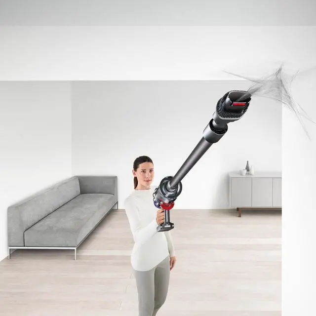 In-line configuration: The motor, bin and cyclone are aligned, so air is drawn into the cyclones in a straight line creating 20% more suction power than the Dyson V8 vacuum cleaner.