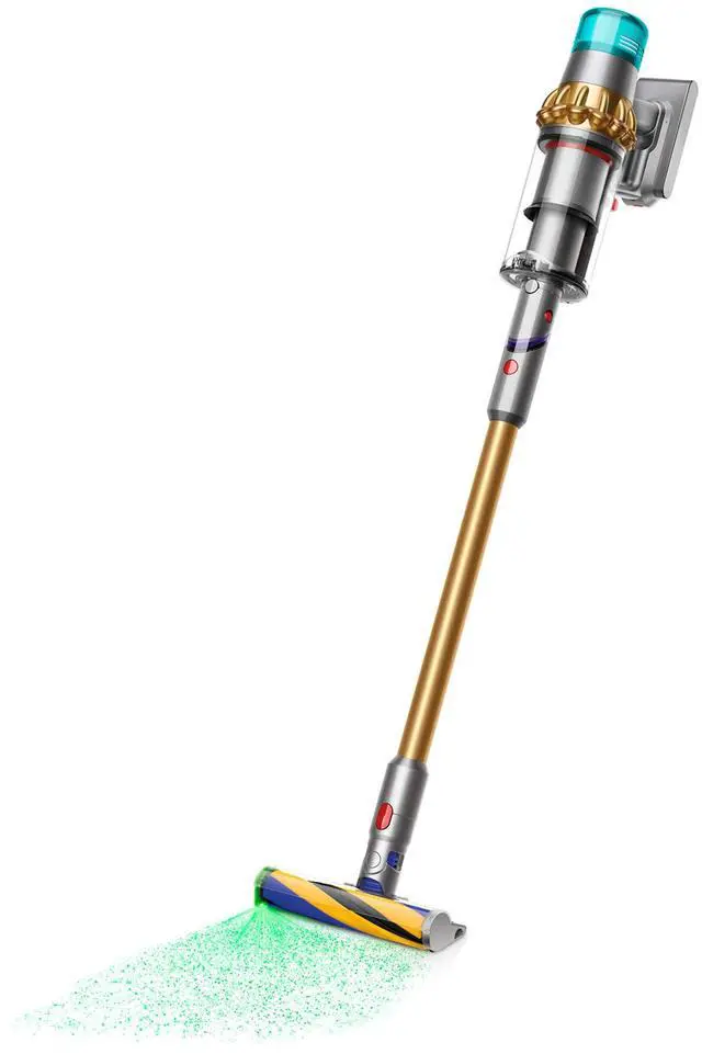 Dyson V15 Detect Absolute | Gold | RefurbishedThe Dyson V15 Detect is Dyson's most powerful, most intelligent cordless vacuum with laser illumination. It is engineered with the power, intelligence, versatility, and run time to deep clean your whole home. A laser on the Laser Slim Fluffy cleaner head reveals invisible dust on hard floors. In auto mode, the machine optimizes power and run time based on floor type, and the debris picked up, reporting it all on the LCD screen. Dyson's de-tangling Digital Motorbar (TM) cleaner head deep cleans carpets and hard floors with hair removal vanes that clear long hair and pet hair from the brush bar.