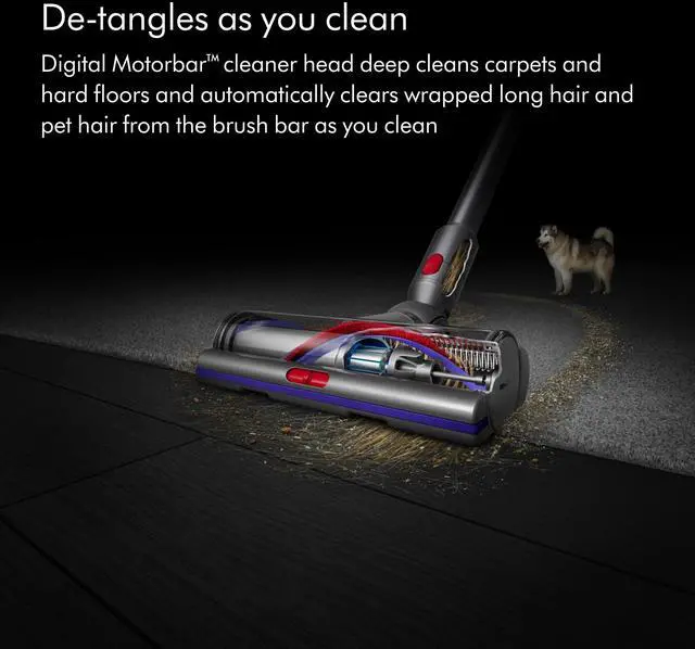 The power to clean anywhere: The versatility of Dyson cordless technology makes cleaning your home easier. Powerful cleaning for floors, hard-to-reach places, and mattresses. Picks up long hair and pet hair. Fast.: Anti-tangle conical brush bar spirals hair off and into the bin. Motor-driven cleaning for small spaces.