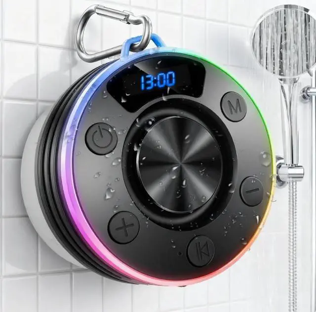 Bathroom Vibrant Light Show and Digital/Time Display: The portable speaker bluetooth comes in 7 romantic colors, adding a new excitement to your. The light colors will automatically change in sync with the rhythm and melody of the music. The LED battery indicator lets you monitor battery levels at a glance, so you never have to worry about running low. Press the TIME button to check the time on your waterproof speaker. The perfect gift for birthdays and holidays to give to family and friends!