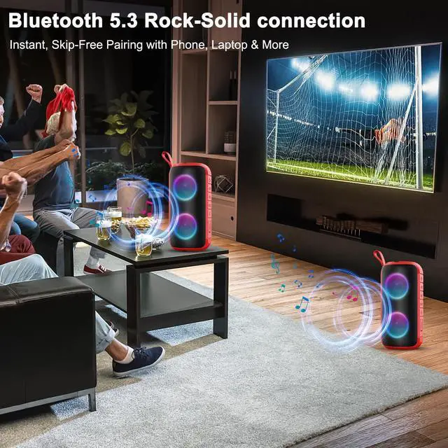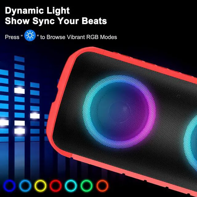 - Dynamic RGB Light Show: Blue tooth speakers outdoorh increase colored light modes and make the lights follow the music. Bring a new level of excitement to your party with the dynamic multi-color light show that syncs to the beat of the music, you can easily customize the light effects to suit your preference by simply pressing the Light button. Make any gathering more memorable with these visually stunning light effects that will elevate the atmosphere.