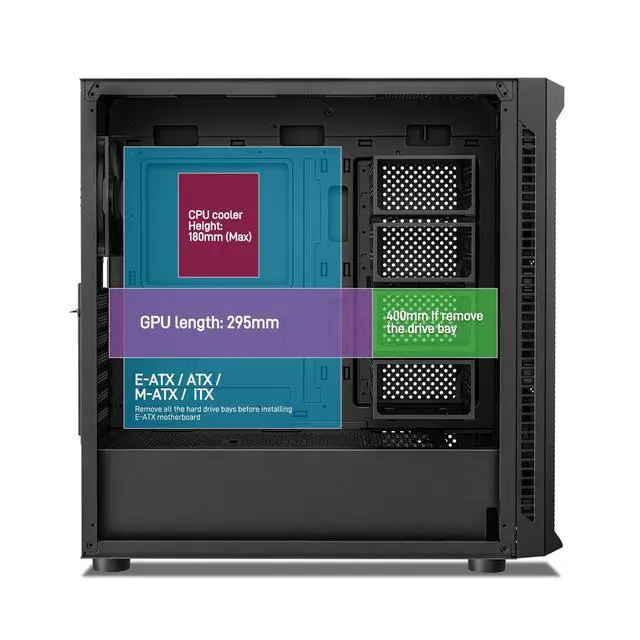 E-ATX Motherboard Supported: E-ATX/ ATX/ M-ATX/ ITX motherboard supported (hard drive cages need to be removed to install E-ATX)