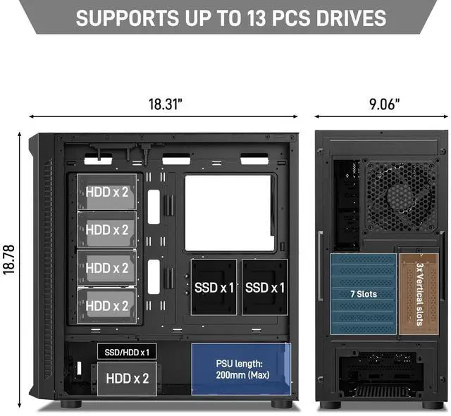 Hard Drives: Supports up to 13 hard disks (10x 3.5 HDD + 3x 2.5 SDD) to reduce storage space shortage, which ensures you have sufficient storage for all your games and data