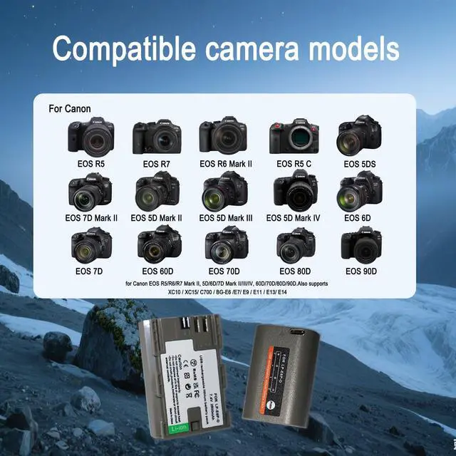 Strong Compatibility: Compatible with the latest cameras. Upgraded LP-E6P replacement battery compatible with Canon EOS R5 Mark II, EOS R6 Mark II, EOS R8, EOS R7, EOS R6, EOS R5, EOS 90D, EOS RF, EOS 5D Mark IV, 5D Mark III, 5DS, 5DS R, 5D Mark II, 6D, 6D Mark II, 7D, 7D Mark II,90D, 80D, 70D, 60D