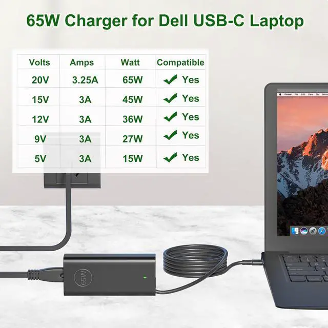 Compatible with Power: 45 Watt, 65 Watt, 15 Watt, 27 Watt, 36 Watt Compatible with Output: 5V 3A, 9V 3A, 12V 3A, 15V 3A, 18V-2.5A, 20V 3.25A Charger Port: Type-C(USB-C)Laptop Charger.
