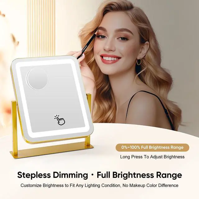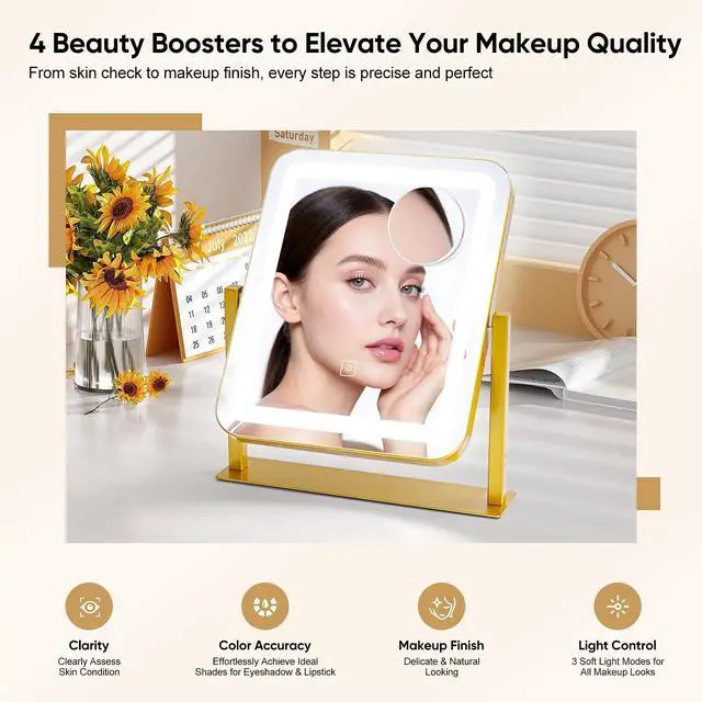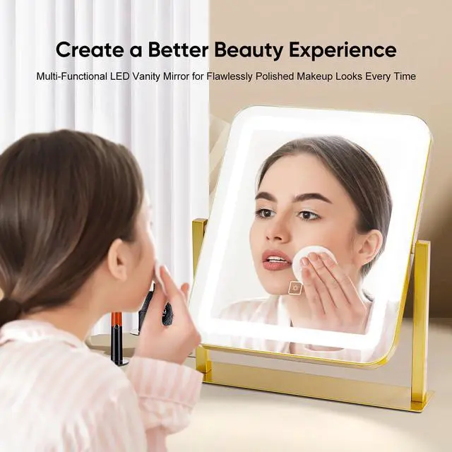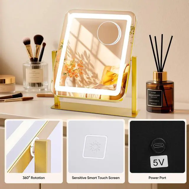 Upgrade your beauty routine with our LED Lighted Vanity Mirrorthe ultimate Hollywood-style makeup mirror designed for precision and style. Featuring 3 adjustable color modes (daylight, cool white, warm yellow) and stepless dimming, you can customize the lighting to match any occasion, from natural daytime looks to glamorous evening makeup. The smart touch control panel lets you switch colors and adjust brightness effortlessly with a simple touch or long press. Built to last, the mirror boasts a sturdy metal frame and a non-slip rubber base, ensuring stability on any tabletop without scratches. The 360° rotation mechanism allows you to lock the mirror at any angle, while the detachable 5X magnifying mirror provides crystal-clear close-ups for detailed tasks like eyeliner and brow shaping. With high-quality LEDs that are gentle on the eyes and rated for 50,000 hours of use, youll enjoy consistent, flicker-free lighting for years. The mirrors perfect size (16" x 14") offers a generous viewing area to see your entire face, neck, and shouldersideal for dorm rooms, bedrooms, or bathroom vanities. Setup is a breeze: no complicated tools requiredjust attach the base with the included screwdriver, plug in the 5V charger, and youre ready to go. Presented in an elegant gift box, this vanity mirror makes a wonderful gift for wives, girlfriends, moms, or friends on birthdays, anniversaries, Christmas, or Mothers Day. We stand behind our product with lifetime customer support and a satisfaction guarantee. If you have any questions, our team is available 24/7 to assist you. Add a touch of Hollywood glamour to your daily routineorder your LED Lighted Makeup Mirror today!