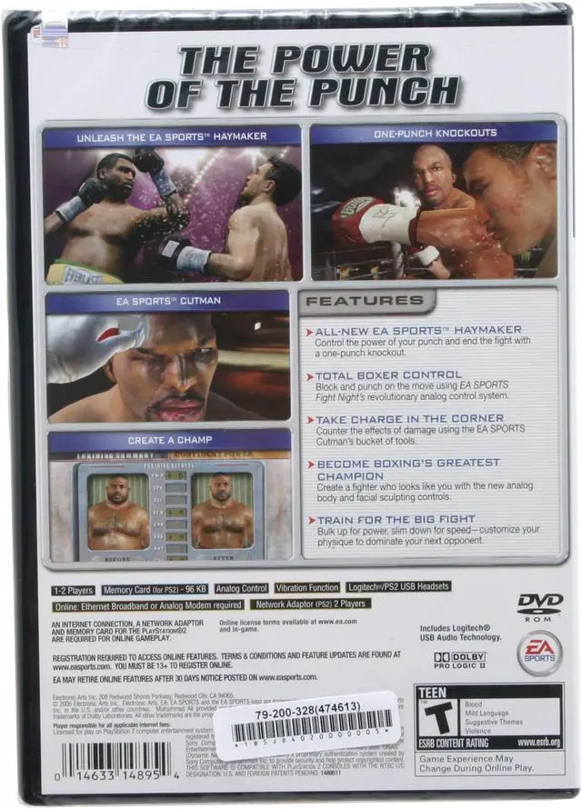 | Features | The EA SPORTS Haymaker: One-punch knockdowns are now a reality—you're always one punch away from flooring your opponent, but miss and you're in trouble. Total Boxer Control: You now have total control of your boxer with 360° Sticking and Moving and the ability to punch and block while dancing around the ring. Create a Champ: Using the analog sticks for total precision, create and train the ultimate champion by transforming his skills and physique. EA SPORTS Cut-Man: You take an active role in recovering from a beating by tending to a swollen eye in the corner between rounds. Dynamic Punch Impacts: Each punch pays off with stunning visuals that reflect the effect of each blow. Your fists have never felt so powerful as injuries affect your fighting abilities— a swollen eye prevents you from blocking, and a broken rib impairs your punching ability and mobility. Next Gen Graphics: Experience the realism as the sweat drips and the muscles flex on the most realistic boxer models ever created. |