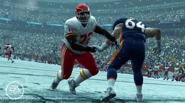 Completely revamped graphics are highlighted by improved stadium models and details including realistic weather effects that'll see the turf turned to mud during scrimmages in the rain – which will affect your players' performance. Television-style openings, booth commentators and HD quality video, along with improved player models will have you believing that this is Monday Night Football. Take total control of every aspect of your team with Franchise mode, or just the running back using an improved animation system that'll have you breaking tackles on your way down the field. Return missed field goals, set audibles and even choose your style of celebrating a touchdown.