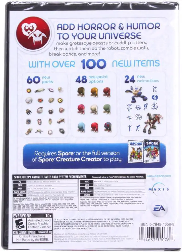 | Features | Expand your creature creativity, with over 100 new Creepy & Cute items With more than 100 new cute and creepy items at your disposal, you have even more power and flexibility to build the perfect creature. Create grotesque creatures with villainous mouths, tuberous eyes, and thorned plates, or go cuddly with big batting eyelashes, cute paws, and adorable details. You can mix and match 60 new parts in all for truly unique looks. Then apply one of 48 new paint styles, and bring it all to life with 24 new animations. And don't forget to publish your new cute and creepy creatures to share them with the world! |