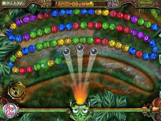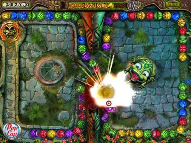 The sequel to the ball-blasting classic! An irresistible force has taken our fearless frog to an island where the ribbeting puzzle-action of Zuma has evolved in amazing ways... but evil spirits and tenacious tiki bosses rule the land! Survive the ire of the island by firing stone spheres to destroy the deadly stream of balls. Conquer over 60 levels by staying sharp and avoiding hidden traps. Slide and hop for smarter shots; hit targets for exotic bonuses; detonate new power-up balls; battle six imposing tiki bosses and guide your agile amphibian to victory in four all new game modes! Will you succumb to the perilous pitfalls, or can you tame the jungle in this PopCap ball-blasting challenge? Features: