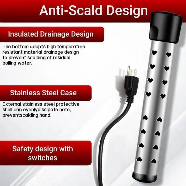 4.Don’t put your hand into the liquid when the electric water heater is plugged in.When the liquid is hot, unplug the immersion heater element , wait for one minutes, then take out from the container, to prevent burns.