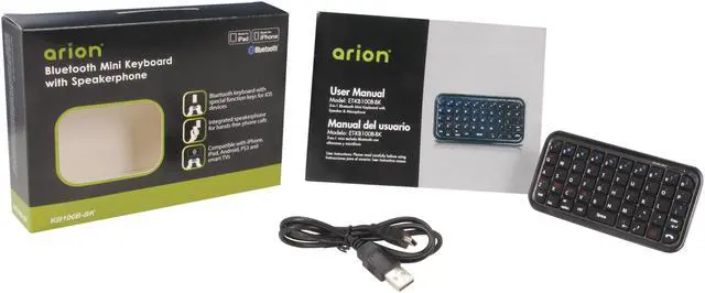 This mini keyboard with speakerphone features dual pairing technology that connects up to two devices at the same time. You can send text messages, make hands-free phone calls and remote control Bluetooth enabled devices. It even works with smart TVs and gaming consoles such as PS3! Great gadget for those with multiple bluetooth enabled devices.Black colorBluetooth v3.0Bluetooth profiles: AVRCP, HSP, HFPKeyboard: 49-keysSpeaker: 0.5 wattsMicrophone: Omni-directionalBuilt-in rechargeable lithium-ion batteryDual-pairing technology connects up to two devices at the same timeSpecial function keys for iOS devicesIntegrated speakerphone for hands-free phone callsCompatible with iPhone, iPad, Android, PS3, and Smart TVsTalk, send text messages, remote control, and moreCharges via included USB cableUnit Dimensions:0.3 x 4.5 x 2.4-inches (H x W x D)Weight: 1.8 ozPackage Includes:Eagle Tech Arion ET-KB100B-BK Mini Bluetooth Keyboard with SpeakerphoneUSB cableUser Manual