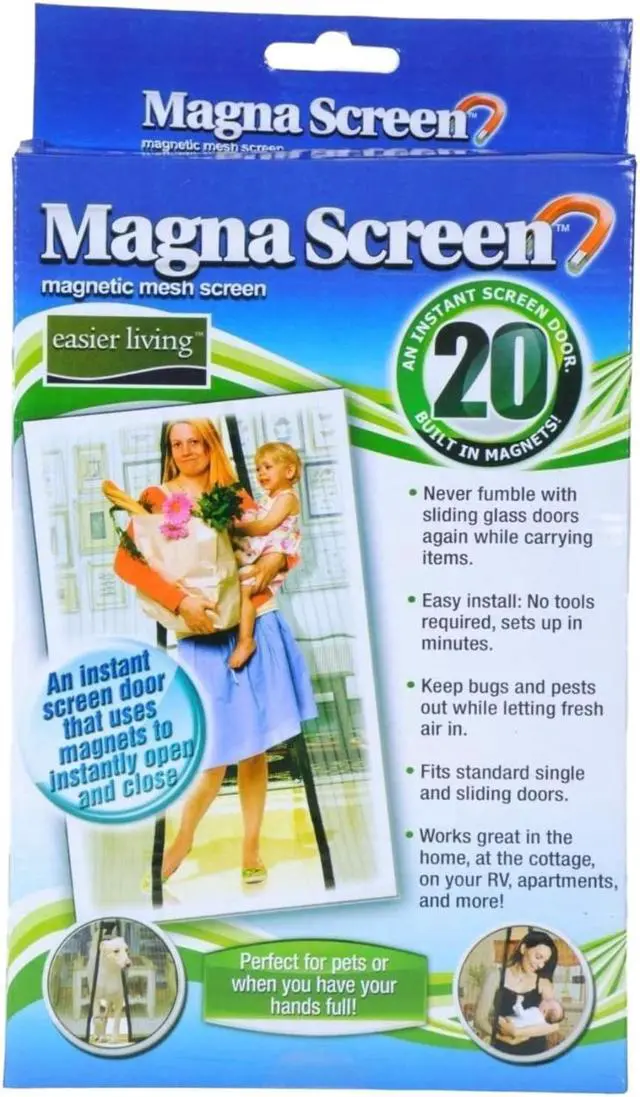 Easy to install: no tools required sets up in minutes keeps bugs and pests out while letting in fresh air uses 20 high-powered magnets to securely open and magically close behind you fits standard single and sliding doors measures (2) 83in x 19.5I n screen panels, 12 hook & loop strips and 20 wood tacks.