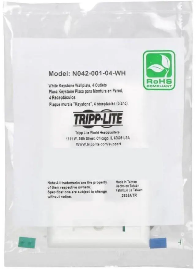 Tripp Lite N042-001-04-WH, 4-Port Keystone Faceplate, use with Tripp Lite N238-Series Cat6/Cat5e Keystone Jacks. Compliant with the Federal Trade Agreements Act (TAA) for GSA Schedule purchases.