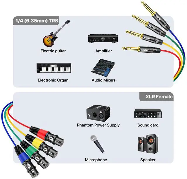 - Anti-Interference Design: 4-channel XLR Female to 1/4 Cables feature a 24AWG oxygen-free copper conductor and multiple shielding designs, effectively reducing signal interference. The TRS connector employs gold-plating technology to minimize further electromagnetic interference (EMI) and radio frequency interference (RFI), ensuring high-fidelity audio signal transmission