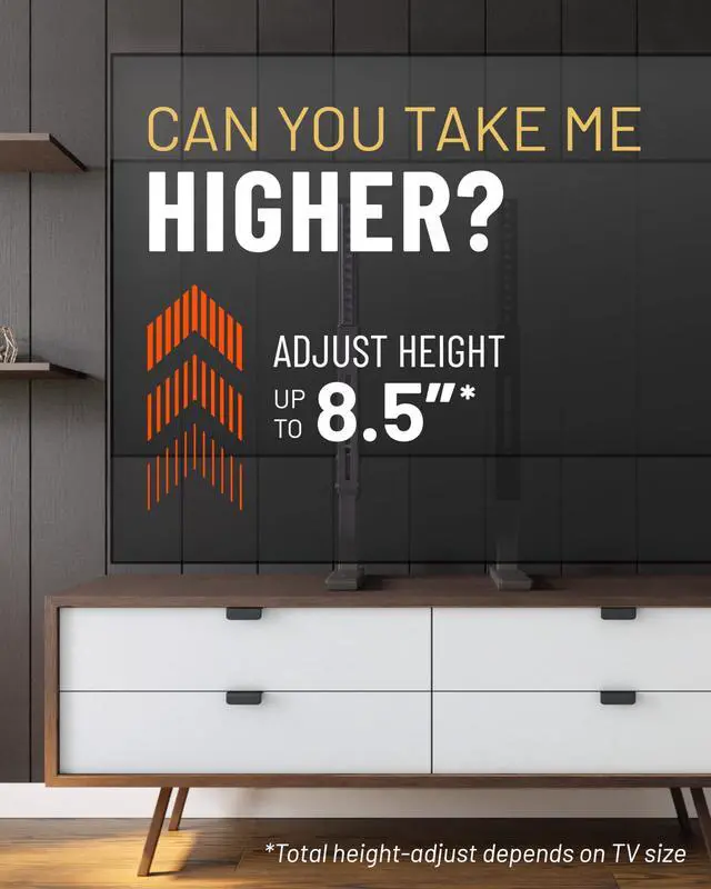 This universal tabletop TV stand is designed to fit 49 to 77 TVs and supports up to 100lbs, making it ideal for large flat-screen or curved TVs in any entertainment space. It offers flexible VESA compatibility, working with screens down to 200x200 VESA patterns, and has no horizontal spacing limits, ensuring a perfect fit for most large TVs. The stand is perfect for narrow furniture or corner placement, letting you position your TV exactly where you want it without compromising stability. Height adjustable up to 8.5, it easily accommodates soundbars underneath, while included rubber pads reduce vibration and improve sound clarity. Grippy rubber bottom pads keep the stand securely in place and protect your furniture from scratches. Crafted from durable alloy steel with a sleek black finish, it blends seamlessly with any decor. All hardware needed for assembly is includedsimply use a screwdriver to attach the stand to your TV in minutes. Sturdy, practical, and easy to use, this stand provides reliable support for your large TV while enhancing your entertainment setup.
