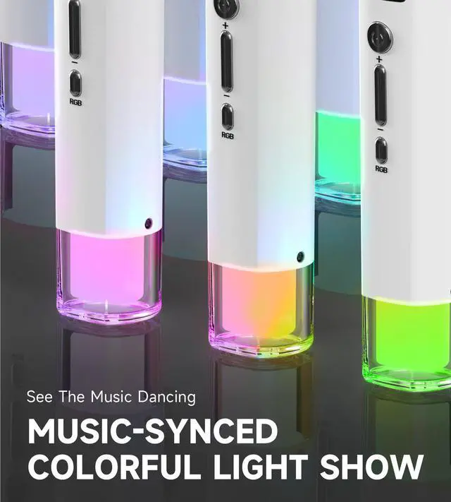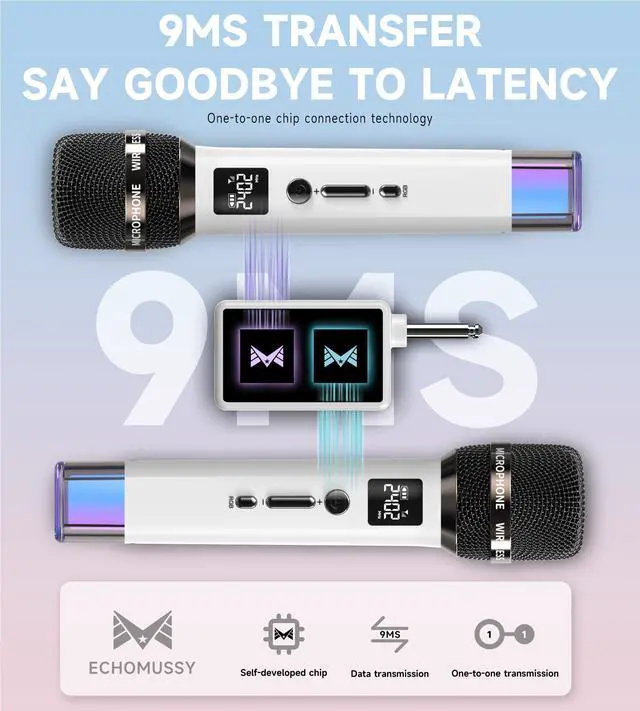 2025 Upgraded Connection TechnologyThe wireless microphones use two intelligent high-speed processing chips to truly achieve one-to-one signal processing reception, making signal reception more stable and faster. Breaking the traditional 2.4G Hz frequency transmission speed, breaking through to the lowest 9ms delay. Let you have the ultimate singing experience. True WirelessWireless microphone system updates frequency, which makes the connection range up to 200 Ft (60m), ensuring a stable and fast connection without worrying about delays and interruptions. Ideal for freedom of movement during performances, this karaoke microphone is wireless and suitable for indoor and outdoor events. Gradient RGB Symphony LightsCyclic and gradient RGB lights, in line with your karaoke aesthetics. It brings you an immersive singing experience and awakens all your senses. 7 lighting modes to switch with one button, start your splendid life. Cardioid Polar PatternThis microphone features a cardioid polar pattern that captures crisp, smooth, and clear sound in front of the microphone, resulting in unmatched performance and a high signal-to-noise ratio. It delivers clear vocals and excellent sound reproduction with no noise and distortion. Singing all DayKaraoke microphones come with a 1200mAh Rechargeable Battery, which could work for 40h. Let you sing and talk happily all day long. Wireless microphones and receivers all adopt a USB-C charging port that only needs 3-4h to fully charge. No need to buy a battery again and again. Plug And PlayKaraoke microphone with new automatic pairing system, it's as easy as just plug and play, no required pairing. The wireless microphone has superior compatibility and is compatible with Mic input Speaker, Singing Machine, Audio Amplifier, PA System, Mixer, Voice Amplifier, And More Streaming Multimedia Equipment.(Please Note: Incompatible with laptop,iPad, or Phone) [What will you get]-- You will get 2 * wireless microphones, 1 * Rechargeable Receiver, 1 * User Manual, 1 * 3.5mm Adapter, 1* Usb-C Cable