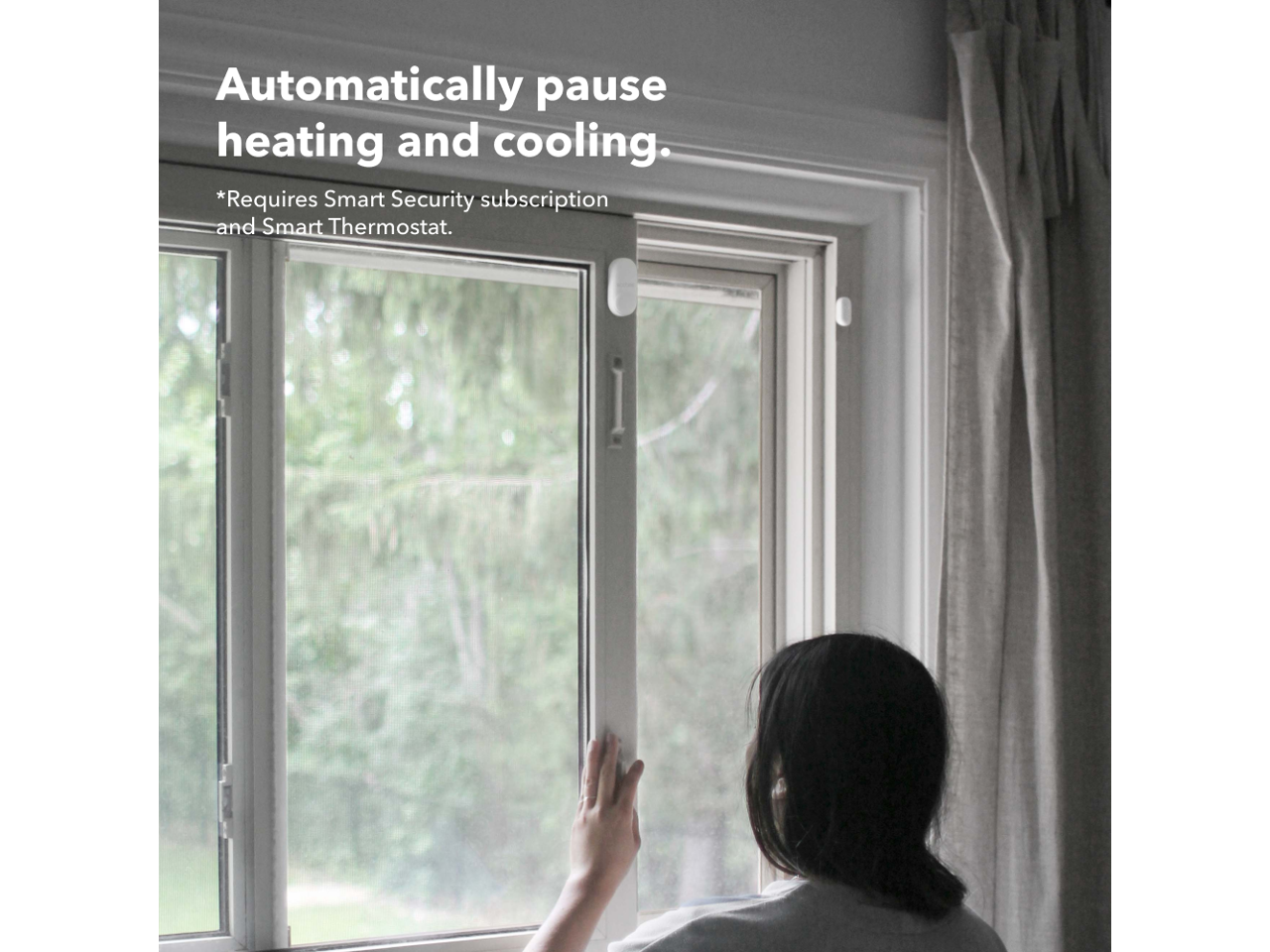 Detects if either a door or window has been open for more than 5 minutes, automatically pausing your HVAC system. Once closed for more than 30 seconds, the HVAC system resumes operation (Feature compatible with ecobee Smart Thermostats. ecobee Smart Security subscription required).