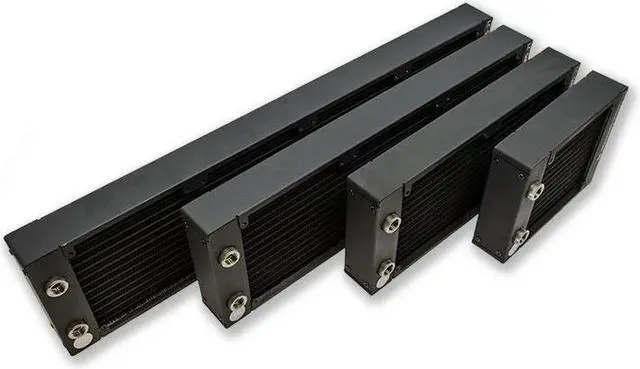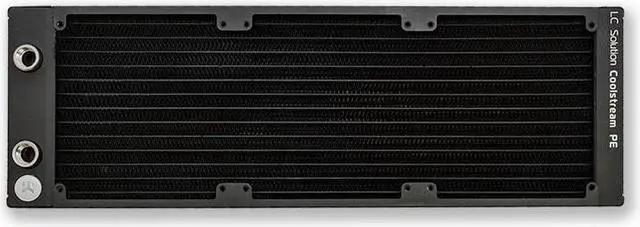 EK-CoolStream PE is a high-performance computer water-cooling radiator which combines EK's unique CSQ design with latest radiator core engine. Built for EK-Vardar 120mm high static pressure fans, these radiators are optimized for maximum heat dissipation across entire fan operational range thus delivering exceptional performance at both low- and high airflow operation. EK assured quality level, optimal price-performance ratio and unique minimalistic design make these EK-CoolStream PE series radiators a perfect choice for any computer water cooled system. This radiator offers best cooling capacity in the 40mm thick radiator class: Double stack copper fins provide massive surface area while the parallel flow cooling chambers reduce hydraulic flow resistance to a minimum. Radiator shrouds are tapped with UNC 6-32 threads on both sides to enable push-pull fan installation to even further increase the cooling performance. This product features two recessed G1/4 threaded ports with pre-installed extenders to allow any G1/4 threaded fitting to be used. EK recommends EK-ACF series compression fittings.