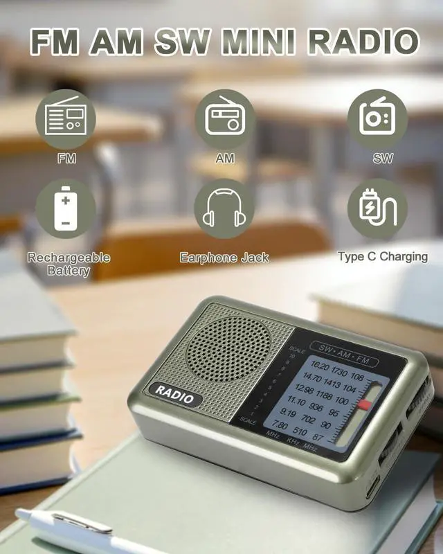 3 Band Mini Pocket Radio with Rechargeable Battery, Portable FM AM Shortwave Radios, Type C Charging Transistor SW Radio with 3.5 mm Earphone Jack for Elderly Kids