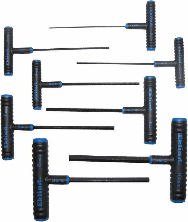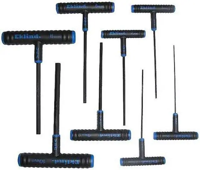 EKLIND's 64608 8 Piece Metric T-Shape Hex Key Set is the ideal tool for a variety of fastening applications. It contains a range of standard hex keys in metric sizes, so you can always have the right tool for the job. The set includes eight metric T-shaped hex keys that measure 6" in length. They are made from alloy steel and come with black oxide finish and plastic handles. Each key has a different tip size ranging from 2 mm to 10 mm, making them ideal for use on various projects. Whether you are working on electrical equipment or household appliances, EKLIND's 64608 8 Piece Metric T-Shape Hex Key Set is what you need to get the job done.