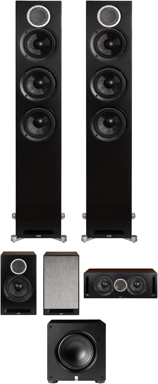 ELAC DFR52-BK Floorstanding Speaker (2019) - Enhanced Bracing - Cast Chassis Woofer - 3x Dual Flared Slot Ports - 3-Way Bass Reflex - 42Hz-35kHz Frequency Response - 6 Ohms Impedance - 87dB Sensitivity - 90Hz/ 2.2 kHz Crossover Frequency - 140W Max Power - 1" Cloth Dome Tweeter - 5.25" Aramid Fiber Midrange - 2x 5.25" Aramid Fiber Woofers - CARB2 Rated MDF Cabinet - 5-Way Metal Binding Posts - Magnetic Fabric Grill - ( 7.28"W x 9.52"D x 39.99"H ) - (Black/Walnut) with a ELAC DFR52-BK Floorstanding Speaker (2019) - Enhanced Bracing - Cast Chassis Woofer - 3x Dual Flared Slot Ports - 3-Way Bass Reflex - 42Hz-35kHz Frequency Response - 6 Ohms Impedance - 87dB Sensitivity - 90Hz/ 2.2 kHz Crossover Frequency - 140W Max Power - 1" Cloth Dome Tweeter - 5.25" Aramid Fiber Midrange - 2x 5.25" Aramid Fiber Woofers - CARB2 Rated MDF Cabinet - 5-Way Metal Binding Posts - Magnetic Fabric Grill - ( 7.28"W x 9.52"D x 39.99"H ) - (Black/Walnut) and ELAC DBR62-BK Bookshelf Speakers (2019) - Enhanced Bracing - Cast Chassis Woofer - Dual Flared Slot Port - 2-Way Bass Reflex - 44Hz-35kHz Frequency Response - 6 Ohms Impedance - 86dB Sensitivity - 2.2 kHz Crossover Frequency - 120W Max Power Input - 1" Cloth Dome Tweeter - 6.5" Aramid Fiber Woofer - CARB2 Rated MDF Cabinet - 5-Way Metal Binding Posts - Magnetic Fabric Grill - ( 8.18"W x 10.82"D x 14.13"H ) - (Walnut/Black) and a ELAC DCR52-BK Center Speaker (2019) - Enhanced Bracing - Cast Chassis Woofer - Dual Flared Slot Port - 2-Way Bass Reflex - 55Hz-35kHz Frequency Response - 8 Ohms Impedance - 87dB Sensitivity - 2.2 kHz Crossover Frequency - 120W Max Power - 1" Cloth Dome Tweeter - 2x 5.25" Aramid Fiber Woofers - CARB2 Rated MDF Cabinet - 5-Way Metal Binding Posts - Magnetic Fabric Grill - ( 20.74"W x 9.52"D x 7.28"H ) - (Black/Walnut) and a ELAC PS350-BK 12" Subwoofer (2023) - 2" Voice Coil - High Excursion Surround - Treated Paper Cone Woofer - BASH Amplifier - Auto EQ - Advanced App Control - ( 16.38"W x 16.46"D x 17.20"H ) - (Black Vinyl)