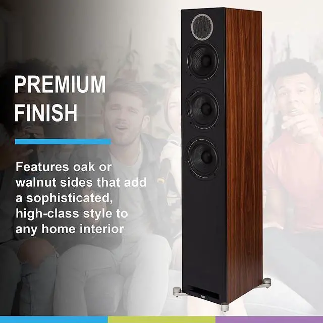 ELAC DFR52-BK Floorstanding Speaker (2019) - Enhanced Bracing - Cast Chassis Woofer - 3x Dual Flared Slot Ports - 3-Way Bass Reflex - 42Hz-35kHz Frequency Response - 6 Ohms Impedance - 87dB Sensitivity - 90Hz/ 2.2 kHz Crossover Frequency - 140W Max Power - 1" Cloth Dome Tweeter - 5.25" Aramid Fiber Midrange - 2x 5.25" Aramid Fiber Woofers - CARB2 Rated MDF Cabinet - 5-Way Metal Binding Posts - Magnetic Fabric Grill - ( 7.28"W x 9.52"D x 39.99"H ) - (Black/Walnut)