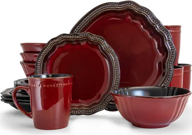 Add a regal touch to your dining table with the Elama Regency 16 Piece Dinnerware Set in Red. Each dish is creatively crafted into unique and contemporary shapes and beautifully colored in vibrant red with gold accents. From sophisticated dinner parties to casual dining, make your dinnerware collection become a staple piece for your kitchen. Each plate is microwave safe for quick reheating and dishwasher safe for easy cleaning. Set for 4 people