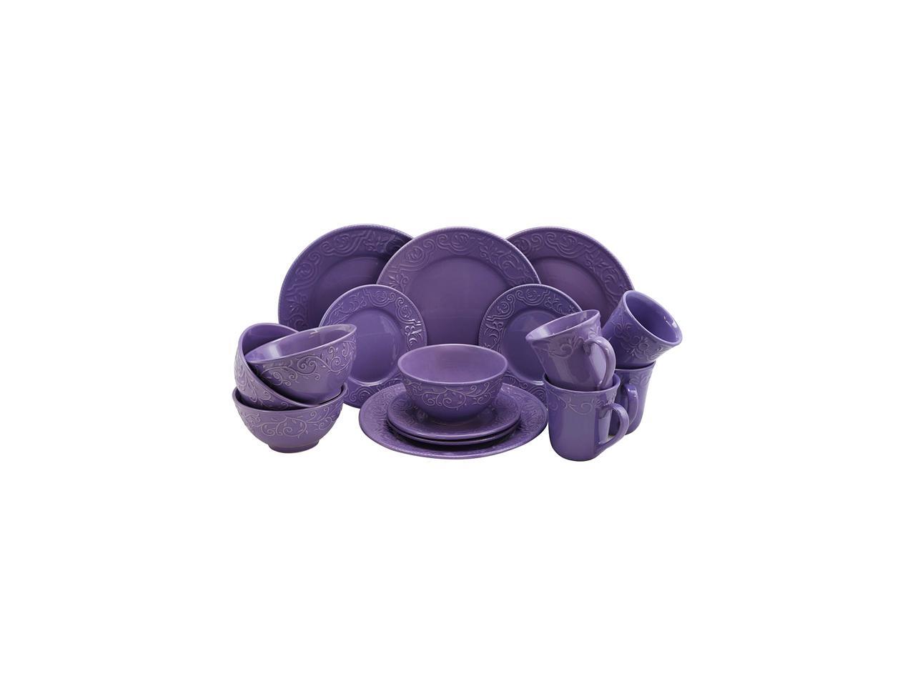 The soothing lavender color of the plates gives it a delicate inviting feel. This beautiful decorative set includes: Four Dinner plates in at 10.5 Inches, Four Salad Plates in at 7.5 inches, Four Bowls in at 6 inches, and Four Mugs in at 16oz.