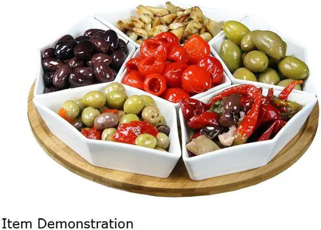 Features Signature 12 Inch 7pc Condiment Server Set with a Bamboo Lazy Suzan Serving Tray