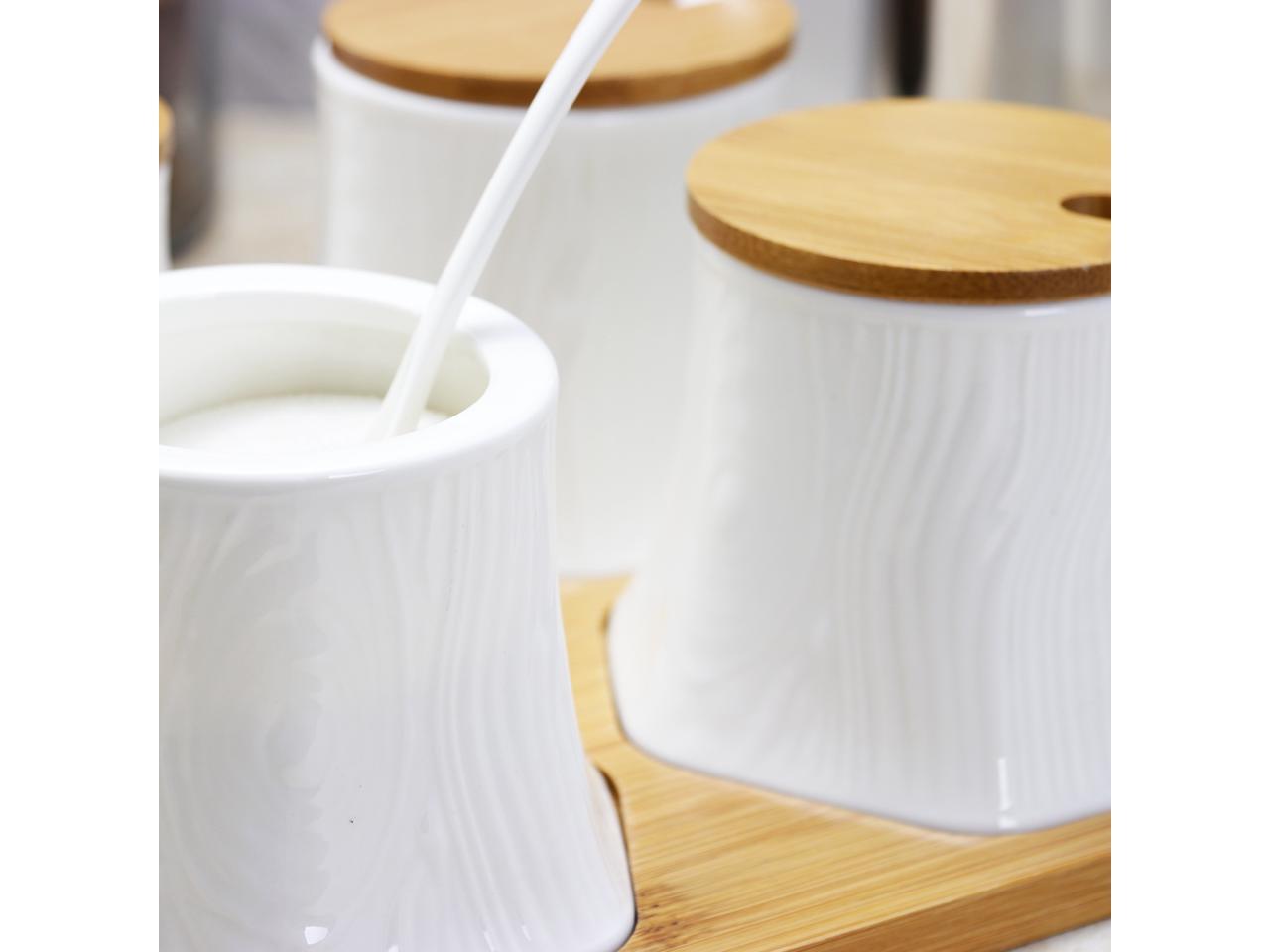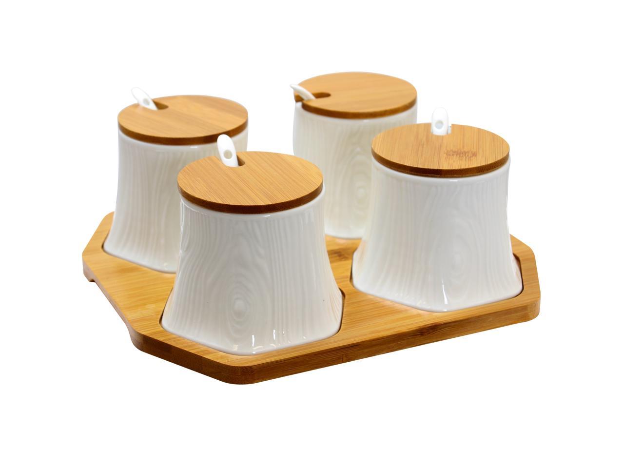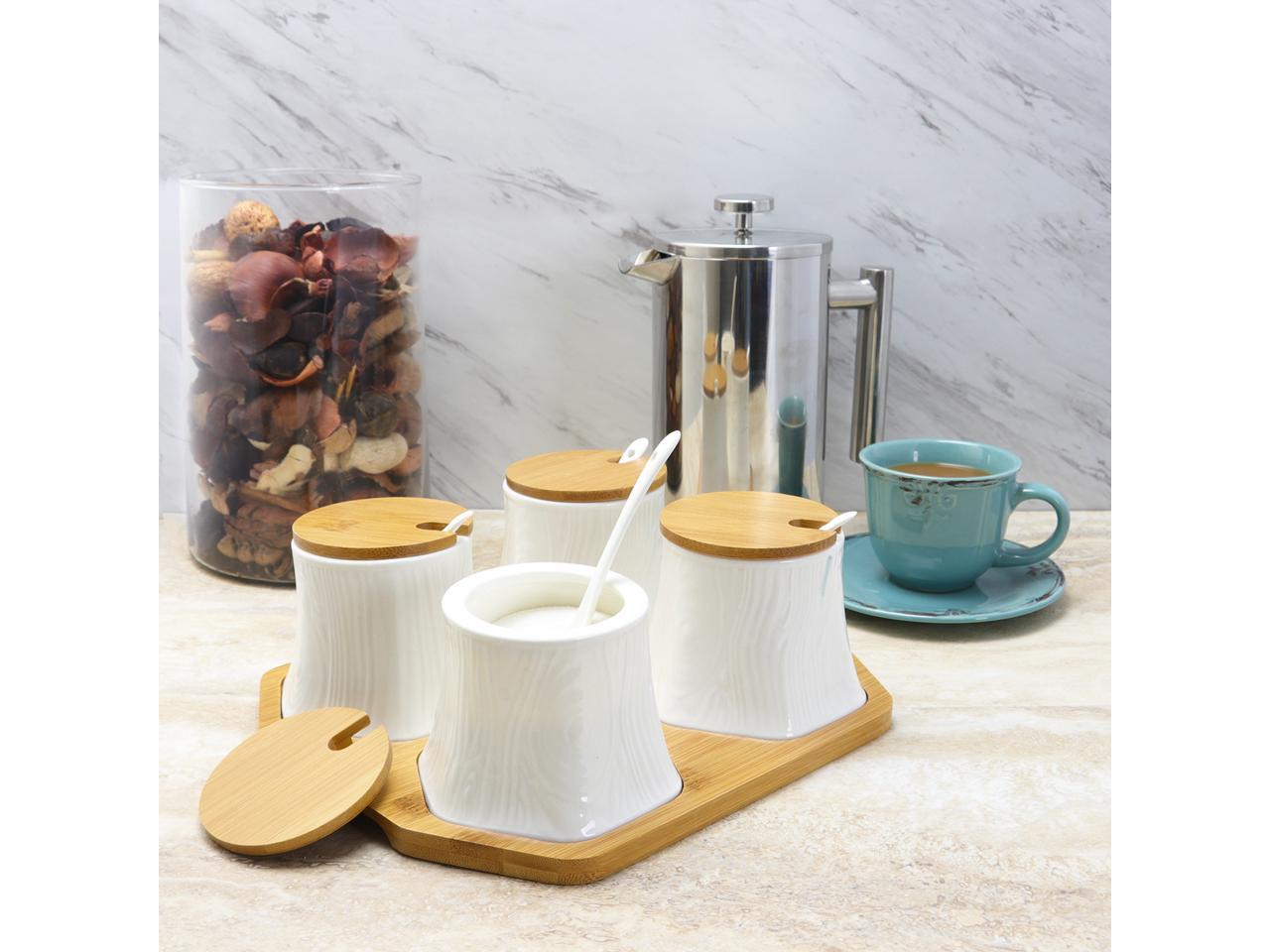 - The set comes with a nice tray where all four jars can sit, really an excellent piece of decor with actual utility. The glamorous white ceramic will complement on any home decor, It's a perfect housewarming gift.