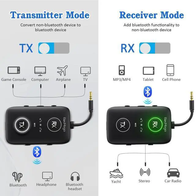 The device is a 2-in-1 bluetooth transmitter receiver that supports TX and RX modes. In TX mode, it turns non-Bluetooth-enabled devices such as TVs, computers, fitness equipment, etc. into bluetooth audio transmitter; in RX mode, it allows wired speakers, car stereos, etc. to connect to your phone or tablet. Bluetooth transmitter airplane also boasts long battery life, with over 20 hours of use on a 2-hour charge in RX mode and over 15 hours in TX mode, making it perfect for traveling.