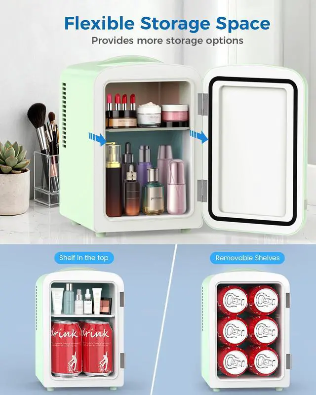• Multifunctional Mini FridgeThis skincare fridge holds 6 cans of 330ml drinks, or your skincare/makeup/medicine collection. Its compact 5.5in×5.3in×7.9in interior is cleverly designed for layered storage of makeup and skincare products. Perfect for desks, vanities, cars & small spaceskeeps essentials cool and handy.