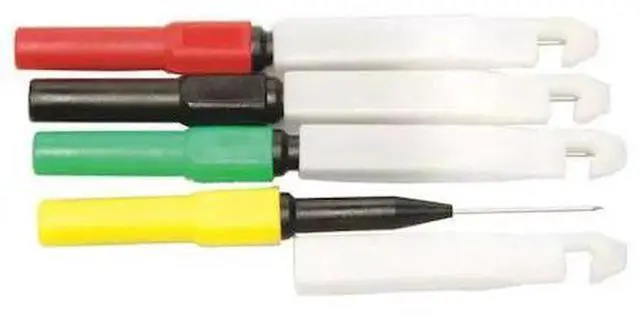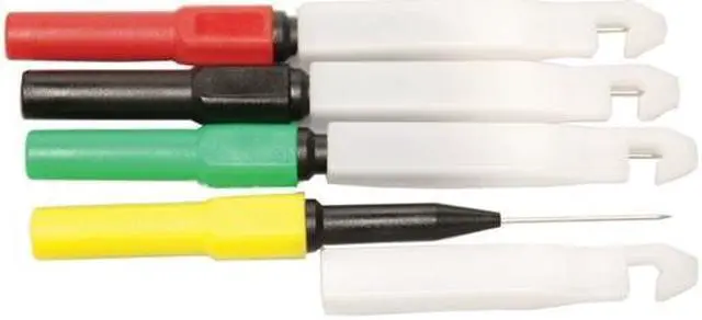 Features and Benefits Great for backprobing weather pack style connectors used with numerous automotive sensors Also very handy for piercing and tapping readings on smaller gauge wires - using the included probe adapters Works with most Test Lead Kits in the field - with standard 4mm banana plug test lead Set includes four probes - red, black, green, yellow Test probes 21 mm lengthThis is an affordable set of back probing test probes which serves dual purposes. One function is to back probe the wire at the rear of the wire harness/connector. This way, the tech avoids having to poke holes in the wire. The small diameter probe can slip into the back of the wore connector and make connection with the signal under test. The second function is the ability to pierce the wire if needed by using the supplied end piece adapter. Although piercing the wire is not advisable, sometimes it just can not be avoided. This set of probes can work with most standard test lead kits in the field. There are four probes included with this part number. This product meets the oversized requirement per UPS/FedEx. The shipping weight reflected is the dimensional weight. This product also meets the large package requirement per UPS/FedEx. The estimated shipping cost will include this fee.