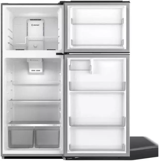 | Features | Element’s 17.6 Cubic Foot Top Freezer Refrigerator is perfect for storing your fresh and frozen foods. With two full-width adjustable glass shelves, you can customize its storage space to fit large or small containers easily. Plus, flexible door storage keeps your gallon-sized drinks handy while freeing up valuable shelf space. Two crisper drawers keep your fruit, vegetables, and leafy greens delicious and ripe. Easily slide the humidity control setting for maximum freshness. LED interior lights emit minimal heat to help you conserve energy while grabbing a late-night snack. The true close door hinge prevents the door from slamming and ensures its always securely sealed shut, so you don’t have to worry about spoiled food. Element refrigerators use R600A refrigerant and are ENERGY STAR® certified, lessening energy usage while also being more eco-friendly. Element fridges’ recessed handle creates a modern look while saving space. Its door is reversible to fit your kitchen layout best. The logo-less exterior and stainless steel look allow it to blend with your current appliances seamlessly. The freezer on the top is equipped with a multi-level wire shelf for storing all your frozen goodies, no matter their size. Element 17.6 cu. ft. refrigerators feature a no-frost system, so your food never frosts over; this reduces the chance for odors and freezer burn that can affect the taste of your food. Plus, our ENR18TFGCS model is ice maker ready, so you can stop filling ice trays. Bring it home. Come with: Refrigerator, power cord, user guide |