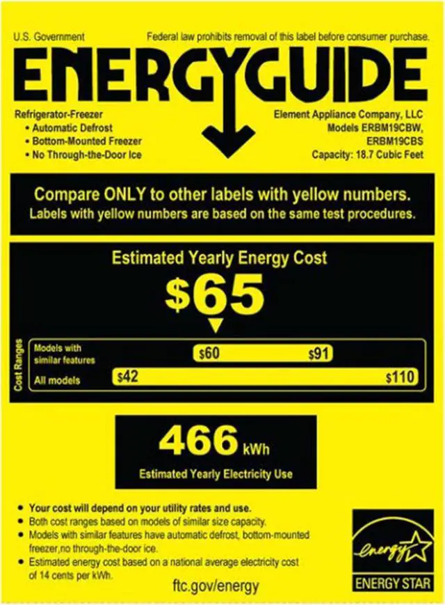 | Features | Element’s 18.7 cu. ft. Bottom Freezer Refrigerator is perfect for storing your fresh and frozen foods. The bottom freezer keeps the refrigerator closer to eye level, so it’s easy to find and grab your family’s food staples, like milk, butter, and eggs. Two full-width adjustable glass shelves make it easy to store large or small containers. Flexible door storage keeps your gallon-sized drinks within reach. Both crisper drawers have humidity control to help keep your fruit, vegetables, and leafy greens delicious and ripe. Easily adjust the humidity control setting for maximum freshness. LED interior lights emit minimal heat to help you conserve energy while grabbing a late-night snack. Element’s bottom freezer refrigerator is ENERGY STAR® certified, lessening energy usage while also being more eco-friendly. Equipped with Multi AirFlow technology, Element's 18.7 cu. ft. refrigerator maintains optimal humidity and airflow, so your food will stay fresher longer. The bottom freezer features a no-frost system, meaning your food will never frost over. Plus, sliding baskets give you easy access to your frozen goodies. The refrigerator door is reversible to fit your kitchen layout best, and the recessed handle creates a modern look while also saving space. The logo-less exterior and white finish allow it to blend with your current appliances seamlessly. Bring it home. |